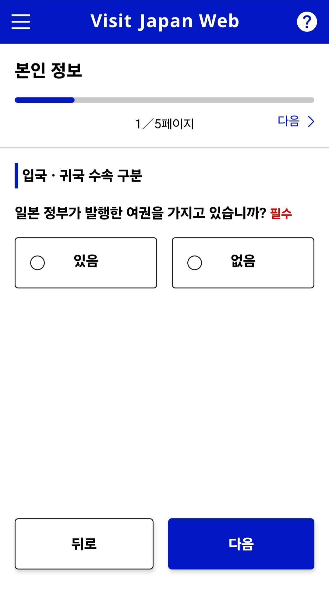 - 비자 보유 여부를 선택합니다. 일반적인 관광 목적이라면 '없음'을 선택하시면 됩니다.